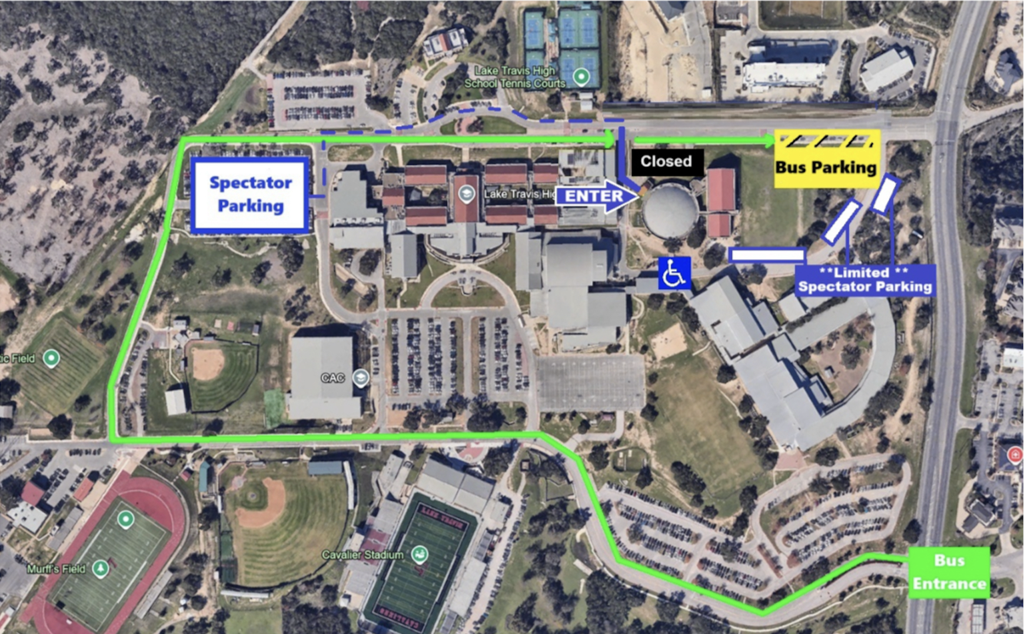 3.. Cafeteria parking will be available for spectators, however this walking route is the longest. You will need to park at the cafeteria and walk down Spillman Loop Drive past the Admin Building and past the tennis courts. We anticipate construction will open the fencing to allow fans to enter through the "normal" front doorway entrance.